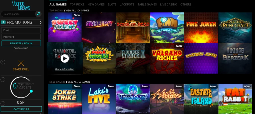The Voodoo Dream Casino site has a futuristic appearance when going through the site. It has a dark background on the games page to make the game choices pop so each one can be quickly seen. This makes it easy to find a favorite game or to spy a new game to play and is different than other casinos since it has a focus on an enchanted world. In this enchanted world bets and winning can give the player spells, which result in free spins, cash or bonuses. This gives the futuristic appearance and casino a unique difference from any other gaming place. It is a casino that should not be missed by customers.